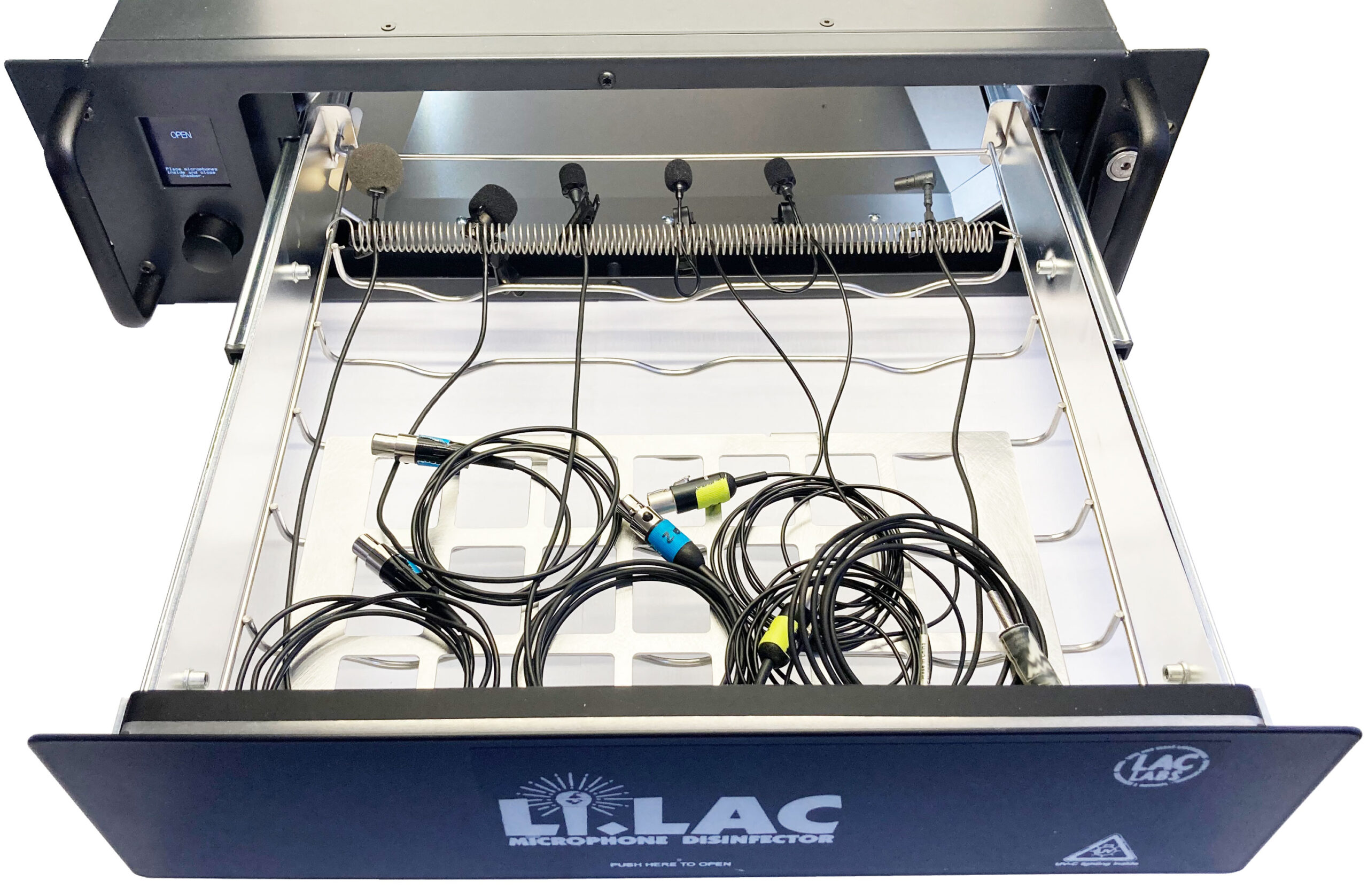 Viruses were sprayed onto microphones*, similar to singing into the mic. The results show a reduction of 99.3% of the viral load on strongly contaminated microphones (including the metal grille and foam) after 10 minutes irradiation inside Li.LAC.